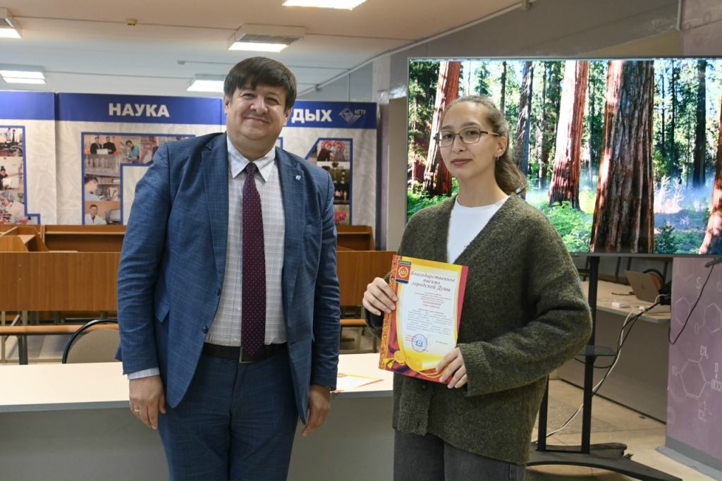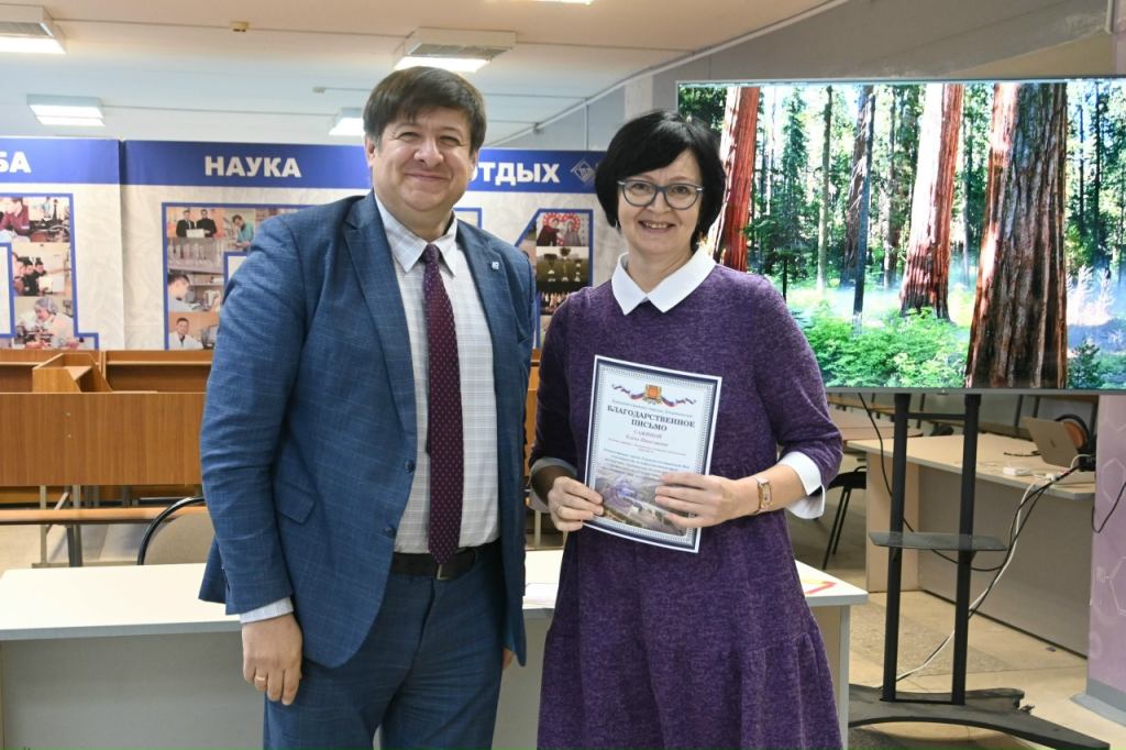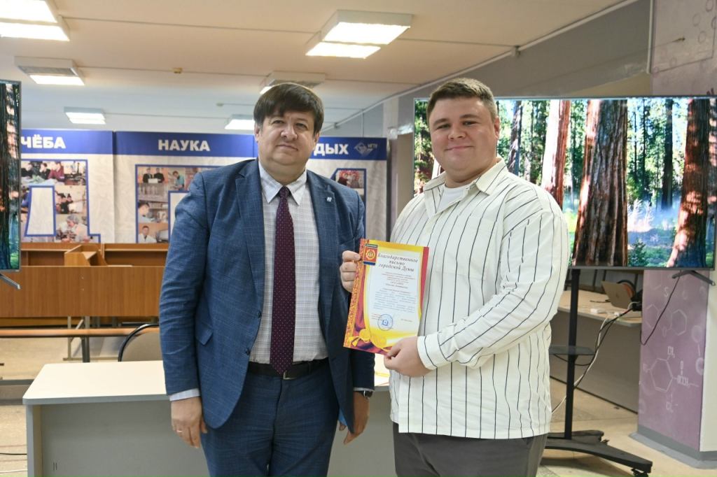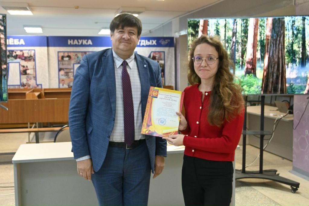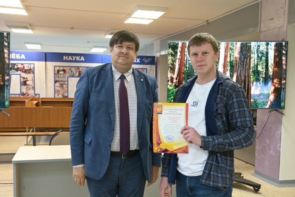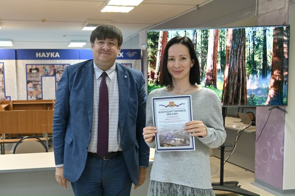 Благодарственными письмами городской Думы города Дзержинска были отмечены: Анна Владимировна Овчарова и Константин Константинович Ширшин, доценты кафедры ХПТ; Денис Максимович Бухаров, Артем Евгеньевич Соколов, Екатерина Михайловна Тутанина - старшие преподаватели кафедры ТОТС; Софья Андреевна Чернышова, ассистент кафедры АЭМИС; Николай Дмитриевич Ерагалин, старший преподаватель кафедры АЭМИС; Дмитрий Вячеславович Седых, преподаватель кафедры ЭГД.