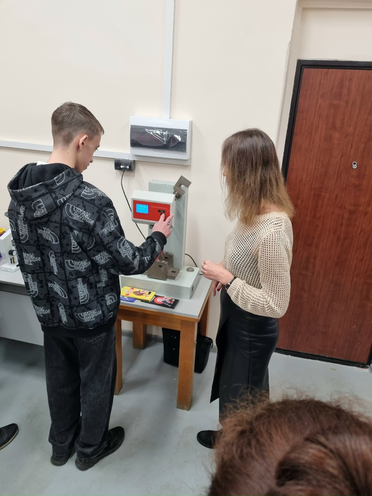 В ходе занятия юные исследователи посетили лаборатории «Метрология, стандартизация и взаимозаменяемость», «Испытания изделий из неметаллических материалов» Опытно-конструкторского центра ДПИ НГТУ. Были измерены размеры образцов изделий с применением различного микрометрического измерительного инструмента, в том числе инструментального микроскопа и получен разброс значений их размеров, по которому в конечном итоге была определена погрешность проведенных измерений.